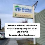 Surplus Sale closing at 5:00 PM May 3-6th May 3, 2023 The Palouse Habitat Surplus Sale store at 304 North Main in Moscow will be closing at 5:00 PM Wednesday, May 3rd through Saturday, May 6th because of staffing issues. Posted in Uncategorized