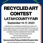 This year Palouse Habitat for Humanity is sponsoring the recycled art contest held at the Latah County Fair. The fair will be held at the Latah County Fairgrounds from September 14th to 17th. The recycled art contest will have three divisions: group, youth, and adult. There will be prizes for 1st and 2nd place, and the display size is limited to 20″ x 20″.