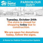 As part of our Building for the Future building remodel, the Surplus Sale is closed to shopping today. Adhesive is being applied to all new countertop services and painting is being done. We are open for donations, follow the signs. Please call 208-882-5246 to reach the store or request a Donation Pick up with the Habitat truck on our Donation page.