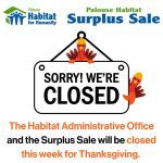 The week of November 20-25th, the Habitat Administrative office and the Habitat Surplus Sale store is closed. The office will reopen Monday, November 27th and the store will reopen Tuesday, November 28th. Please note that for the rest of November and all of December, the Surplus Sale Donation Truck will not be out for pick-ups or deliveries. If you know someone who wants part-time, flexible work on the Habitat Delivery and Pick-Up Crew, please contact the office!