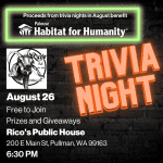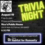 Looking for a fun way to spend your Tuesday nights in Pullman? Rico’s Public House is hosting Trivia Night every Tuesday in August at 6:30 PM, and all donations collected will benefit Palouse Habitat for Humanity.