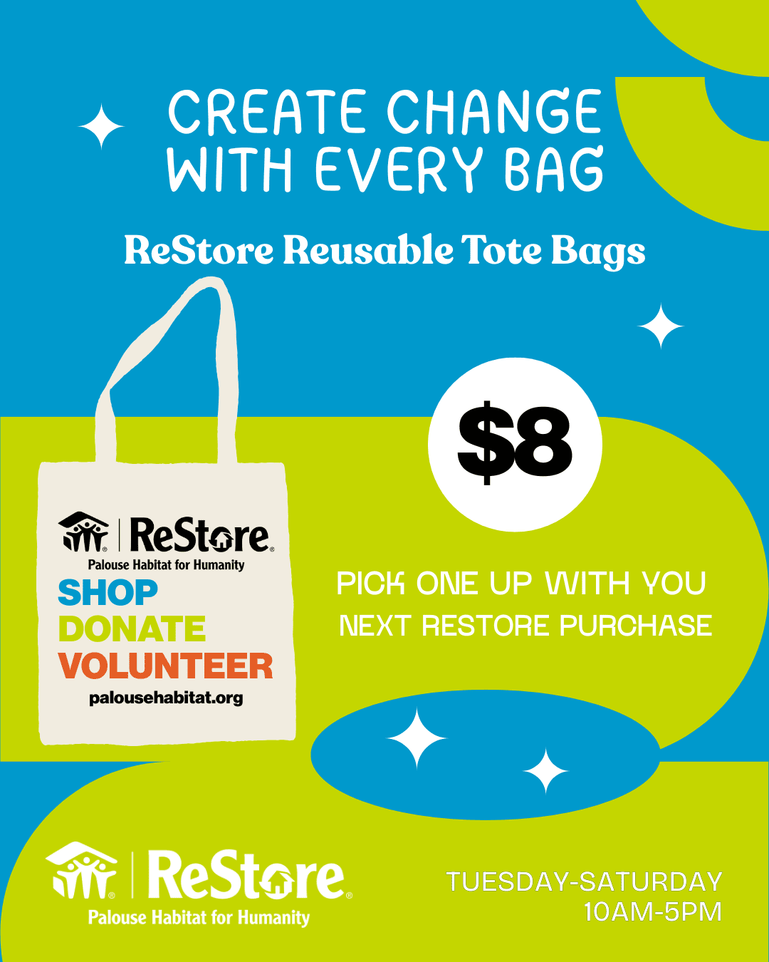 The Palouse Habitat ReStore is excited to offer brand new reusable shopping bags! These durable, eco‑friendly bags help reduce waste while supporting Habitat’s mission.