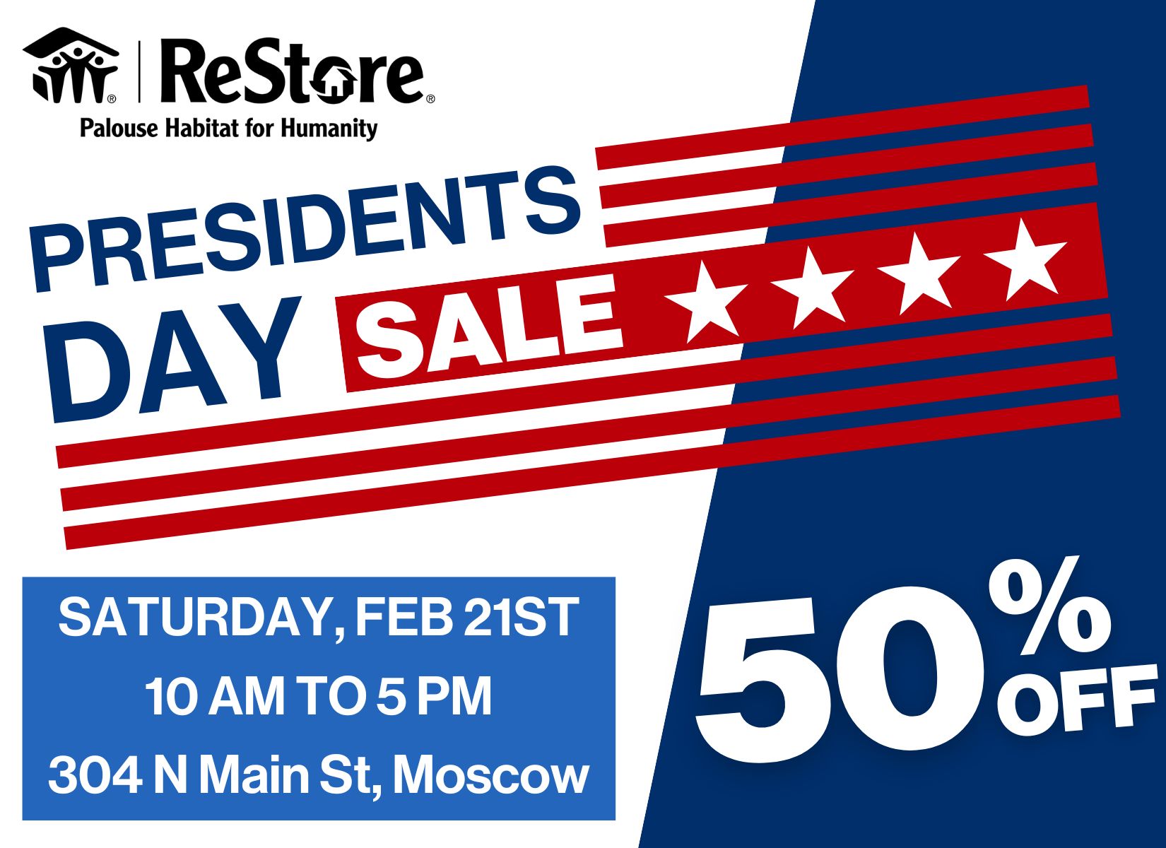 The Palouse Habitat ReStore is kicking off President’s Day with our biggest savings of the month—50% off EVERYTHING!