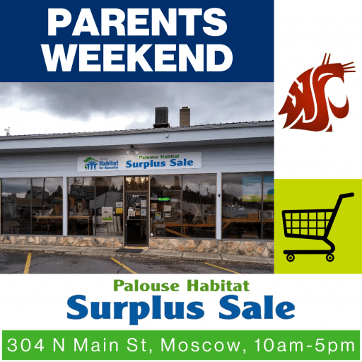 WSU Parent’s Weekend Happy parent’s weekend, Washington State University! If you’re looking for something fun to do with the family, check out the Palouse Habitat Surplus Sale. The Surplus Sale has furniture, art, tools, and more! You never know what you may find. Stop by the store at 304 N Main St, Moscow, from 10am…