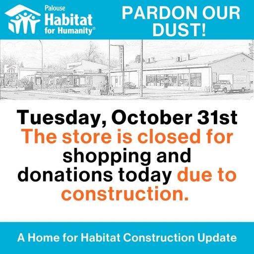 It’s not a trick…the Palouse Habitat Surplus Sale store is closed today, Tuesday, October 31st for shopping and donations. As part of our Building for the Future campaign, they are running a forklift as part of a fire door installation. The store should be open tomorrow, Wednesday, but stay tuned. You can call the store at…
