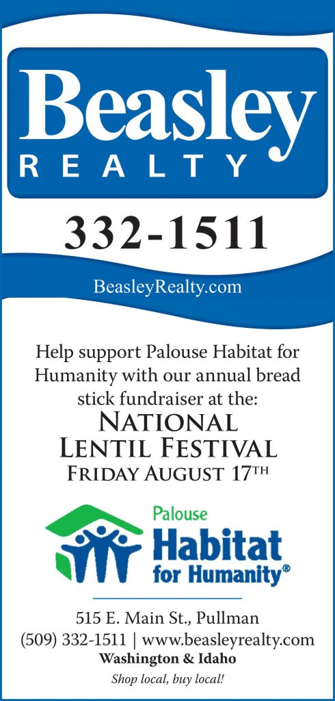 Stop by the Beasley Realty booth at the National Lentil Festival Friday, August 17. Buy a $1.00 breadstick to go with your chili — all proceeds support Palouse Habitat’s home building efforts!
