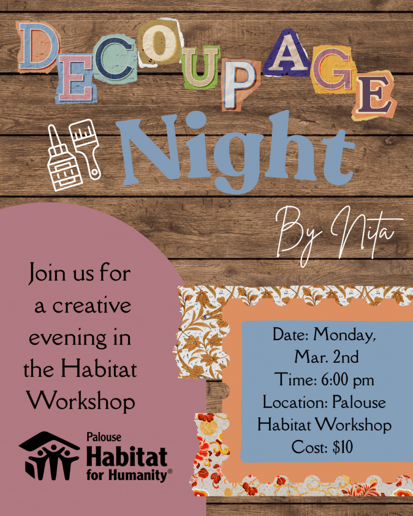 Get creative with us at Decoupage Night! 🎨✨ Join Nita in the Palouse Habitat Workshop for a fun, hands‑on evening of crafting, color, and community. All skill levels welcome! 📅 Monday, March 2 ⏰ 6:00 PM 📍 Palouse Habitat Workshop, 315 N Washington St, Moscow, ID 💲 $10 per person Spots are limited—save your seat…