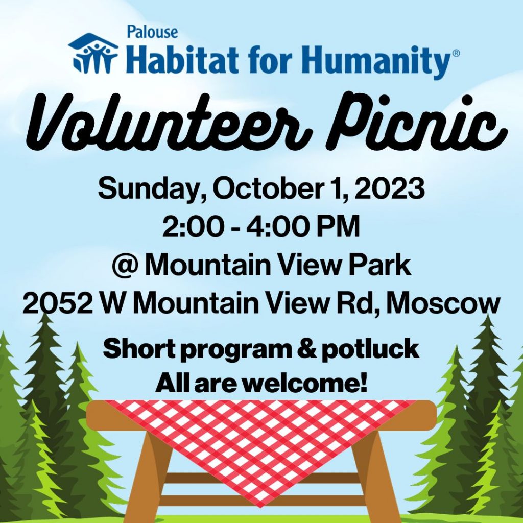Calling all Habitat volunteers! Habitat’s annual volunteer picnic is Sunday, October 1st from 2 to 4 PM at Mountain View Park. Everyone is welcome to join us in this new location for our annual event to honor our amazing volunteers. There will be a short program. It’s a potluck so bring a dish to share.…