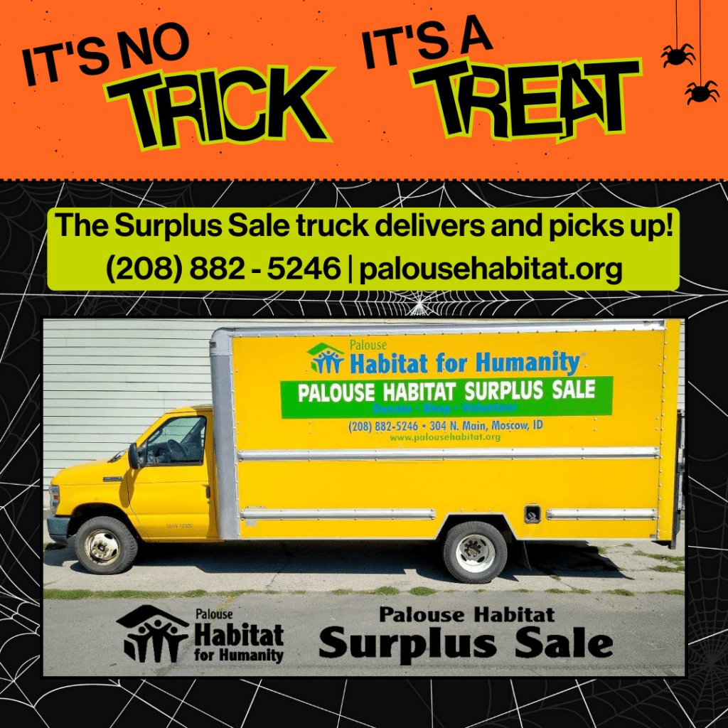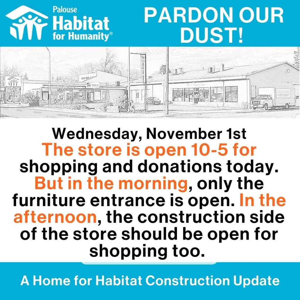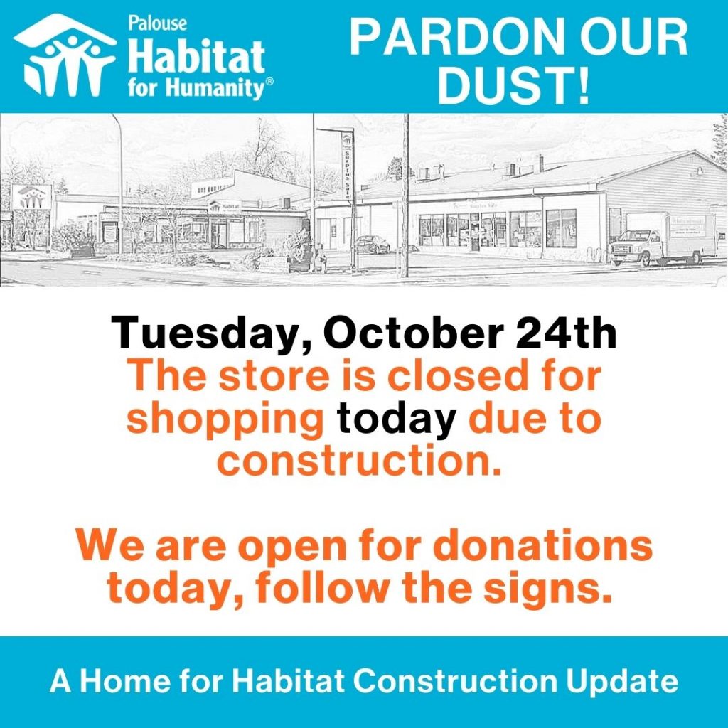 It’s not a trick…the Palouse Habitat Surplus Sale store is closed today, Tuesday, October 31st for shopping and donations. As part of our Building for the Future campaign, they are running a forklift as part of a fire door installation. The store should be open tomorrow, Wednesday, but stay tuned. You can call the store at…