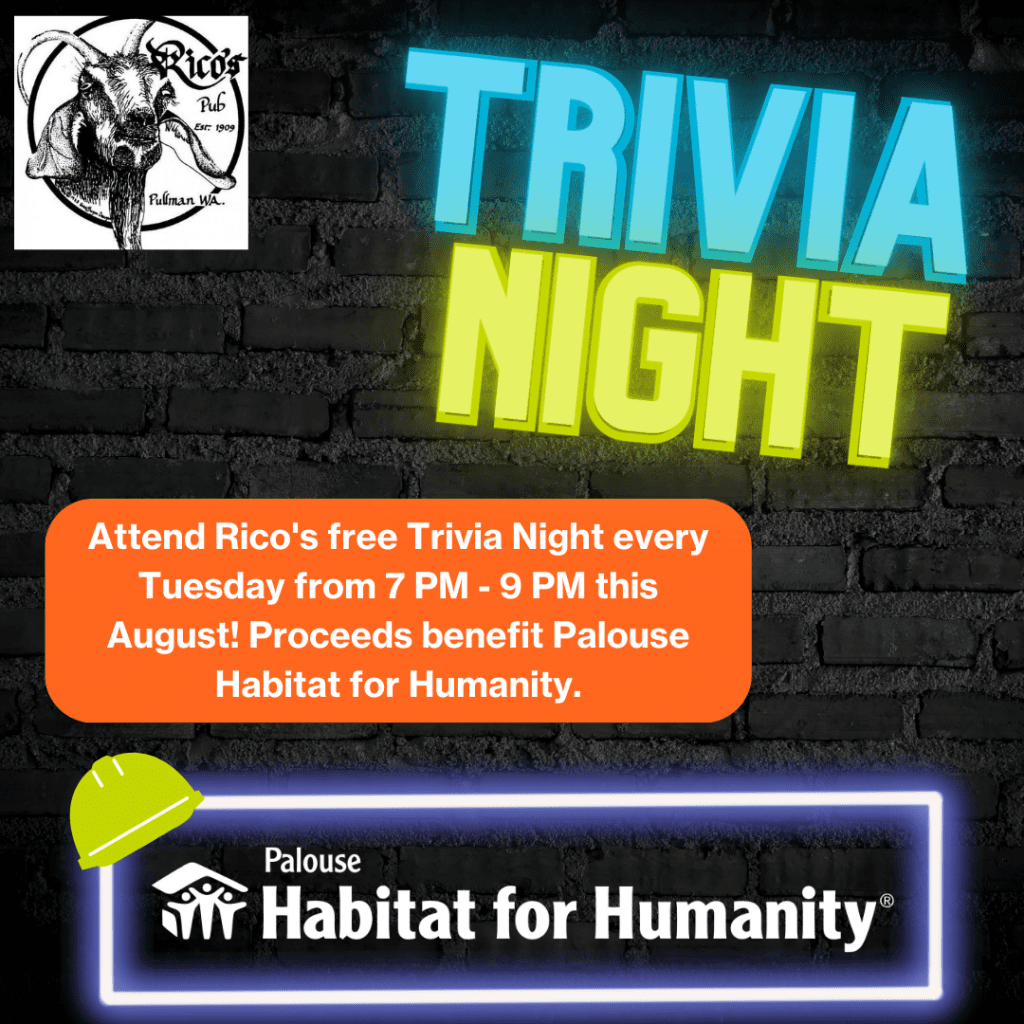 Trivia Night! Show off your trivia skills and support Palouse Habitat for Humanity every Tuesday from 7 PM – 9 PM this August at Rico’s Pub! It is free to play, and there are prizes and giveaways! All proceeds from trivia nights in August will benefit Palouse Habitat for Humanity. See you there!