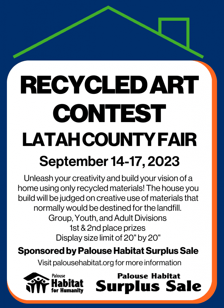 This year Palouse Habitat for Humanity is sponsoring the recycled art contest held at the Latah County Fair. The fair will be held at the Latah County Fairgrounds from September 14th to 17th. The recycled art contest will have three divisions: group, youth, and adult. There will be prizes for 1st and 2nd place, and…
