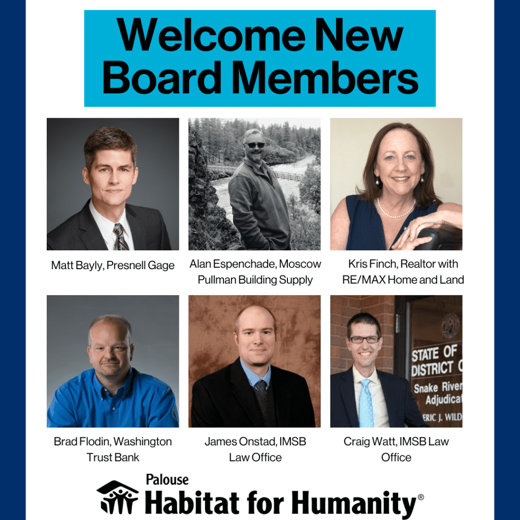 Palouse Habitat is excited to welcome new members to the new 2023 Board Members Palouse Habitat or welcoming six new board members: Matt Bayly, Presnell Gage Alan Espenschade, Moscow Pullman Building Supply Kris Finch, Realtor with RE/MAX Home and Land Brad Flodin, Washington Trust Bank James Onstad, IMSB Law Office Craig Watt, IMSB Law Office…