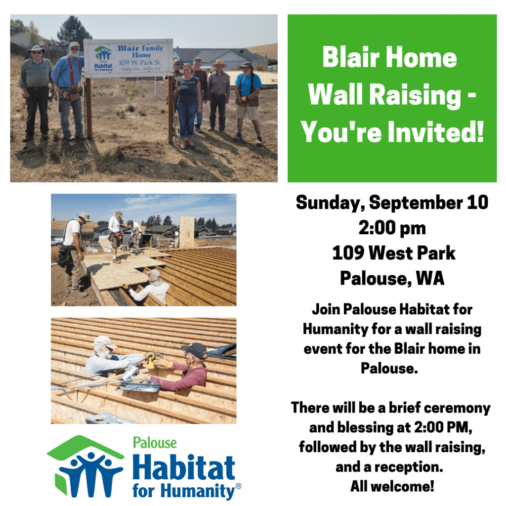 2023 Homeowner Selection and Wall Raising Announcement Palouse Habitat for Humanity has selected the future homeowner for its 23rd home build. The public is invited to celebrate with a Wall Raising on Sunday, September 10 at 2:00 at the home at 109 W. Park Street, in Palouse, Washington.
