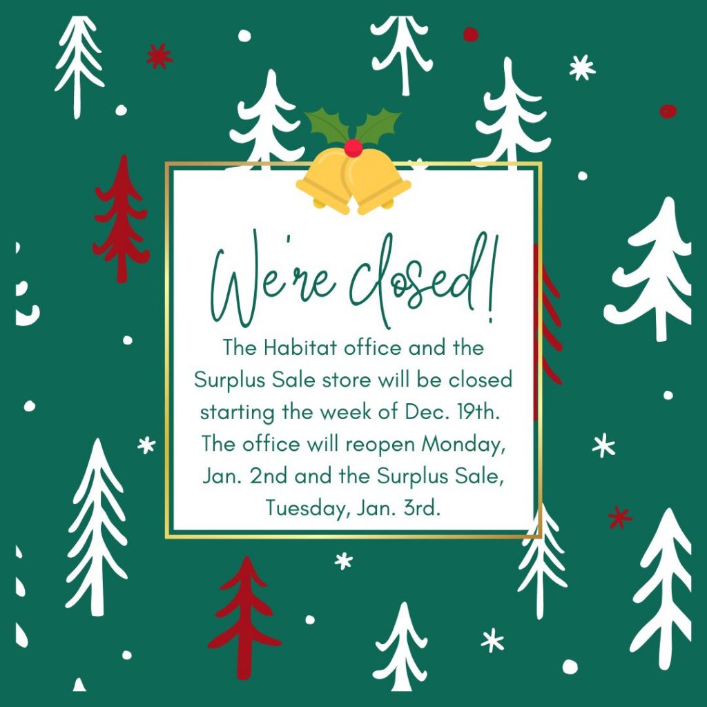 The Habitat office and the Surplus Sale store will be closed starting the week of Dec. 19th. The office will reopen Monday, Jan. 2nd and the Surplus Sale, Tuesday, Jan. 3rd. If you call the office 208-883-8502 your call will be returned on January 2nd. You can email habitat@palousehabitat.org if you would like a quicker…
