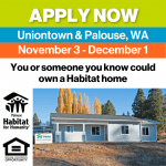 Event: Homeowner Applications Open — Uniontown & Palouse 📅 November 3 – December 1, 2025📍 Palouse Habitat for Humanity, serving Latah & Whitman Counties Palouse Habitat for Humanity is reopening homeowner applications for families in Uniontown and Palouse, WA. This is a unique opportunity for qualifying families and individuals to partner with Habitat to build…