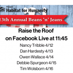 Join us at on Facebook Live at 11:45 all this week as we hear from Habitat volunteers, supporters and donors on the need to Raise the Roof! Monday April 12 11:45: Nancy Tribble, Board Member and Volunteer Tuesday April 13 11:45: Dan Hardesty, Codger Crew member Wednesday April 14 11:45: Owen Wallace, volunteer and donor…