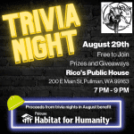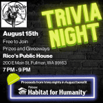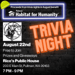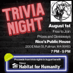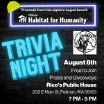 Trivia Night! Show off your trivia skills and support Palouse Habitat for Humanity tonight, Tuesday, August 22nd, from 7 PM – 9 PM at Rico’s Pub! It is free to play, and there are prizes and giveaways! All proceeds from trivia nights in August will benefit Palouse Habitat for Humanity. See you there!